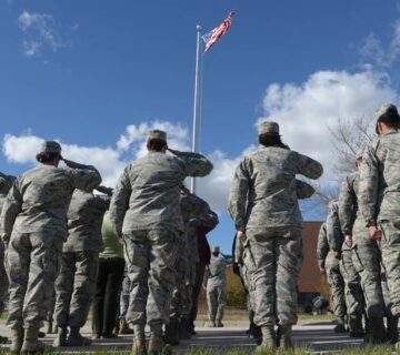 5th Air Force Woman to Attempt Special Operations Training-Airmen salute the American flag as it is lowered during the women’s retreat ceremony at Ellsworth Air Force Base, S.D., April 7, 2016. (U.S. Air Force/Airman Donald C. Knechtel/Released)